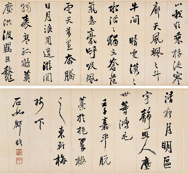 縱觀鄧石如一生,他雖少產窮鄉,家復貧寒,但客江寧梅氏家八載,廣窺名跡,苦攻篆書五年、隸書三年,兼及楷草,由石刻而冥追古人之法,縱橫闔辟,深精四體,蔚成大家。后以書刻游京師,聲名鵲起,震動公卿,當時身居高位、負有盛名的貴官翁方綱因鄧石如赴京后未登門拜訪,或因二人書風不合,極力詆毀鄧石如。鄧石如處此逆境,不為所動,意志彌堅,彰顯了一代書家勇于特立獨行的品格與意志。后鄧石如遭迫害,憤然離京,仍以鬻書自給,芒鞋竹杖,廣游山水,悠然千里,自號笈游道人,布衣終生。
