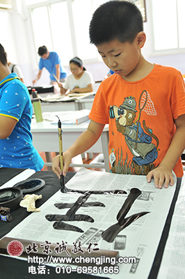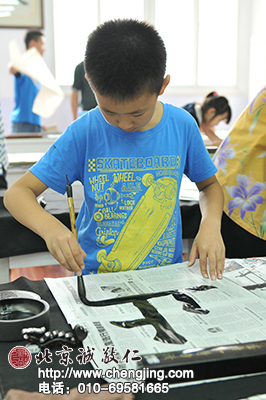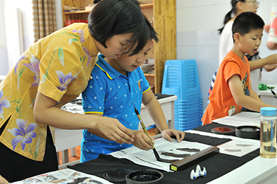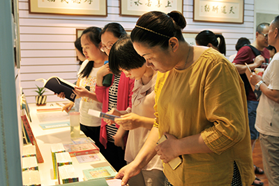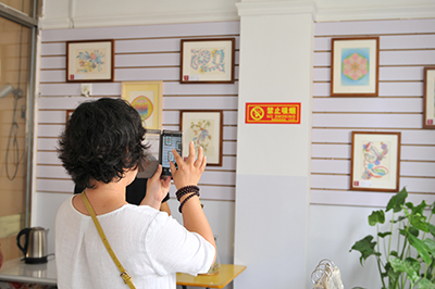 課余期間,學員們穿梭于教室之中,新奇的翻閱傳統(tǒng)文化產品,欣賞墻上一幅幅書法及彩繪作品。長廊兩側掛滿了書法學員的練習作業(yè),記錄了他們快樂學習書法的成長歷程。