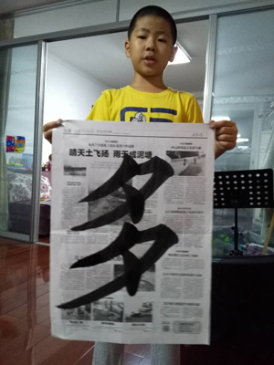 兩年前,東東剛上一年級時,正好我當時工作的繪本館準備辦一個書法班,請來一位在讀書法研究生來教書法。我也覺得學習書法可以靜心怡情,鍛煉意志,提高文化素養。上了一堂試聽課之后,東東對用毛筆寫字表現出很大的興趣,于是就報名了。老師說,孩子們還小,控筆能力還比較弱,先從篆書寫起,就像畫畫一樣,順便讓孩子們了解漢字的來歷及演變。家長們都覺得不錯,于是先后有幾個孩子報名,開始上課了。可是年輕的九零后老師控場力不夠,對其中幾個淘氣的男孩完全hold不住,經常上著課孩子鬧的一踏糊涂,地上墻上都是墨汁,不過老師告訴我東東每次上課都很認真。但是沒過多久老師就因為學習時間緊張不來了。第一次學書法就這樣以退費結束了,但我一直想再給東東找一個合適的書法老師。