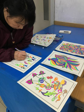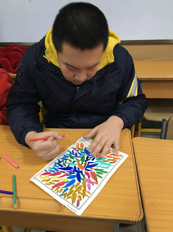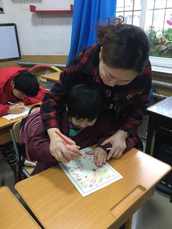 培智學校的老師在2016年1月參加了「張家灣道德講堂」書法公益培訓。他們接觸了多元德藝教學法,感覺彩繪特別適合作為學生的新教材。隨后就將彩繪人生并安排入康復課程,全體師生以及部分家長都加入了彩繪的練習。