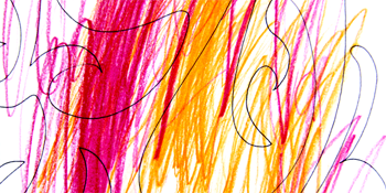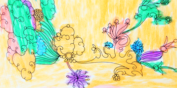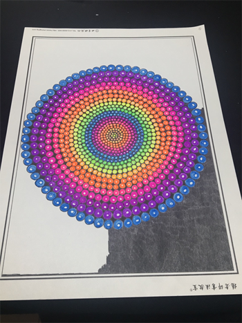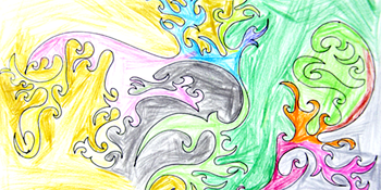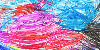 老師只能握著他的手在他情緒好的時候一起進行彩繪人生繪畫,這張作品圓形部分是老師握他手一起畫的,旁邊的紅色和黃色線條是他不讓老師幫他,自己涂的。