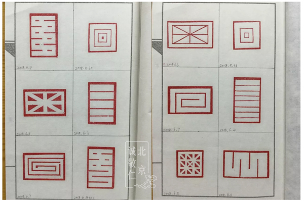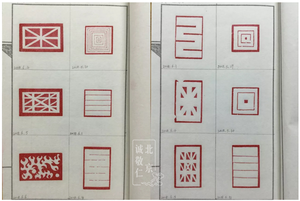 作業(yè)印譜本上滿滿的印章,記錄著大家認(rèn)真的付出。 嚴(yán)格要求初學(xué)者至少完成六方形狀各異的直線圖案,經(jīng)老師檢查過關(guān)后方可進(jìn)入下一關(guān)。