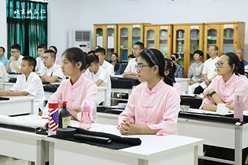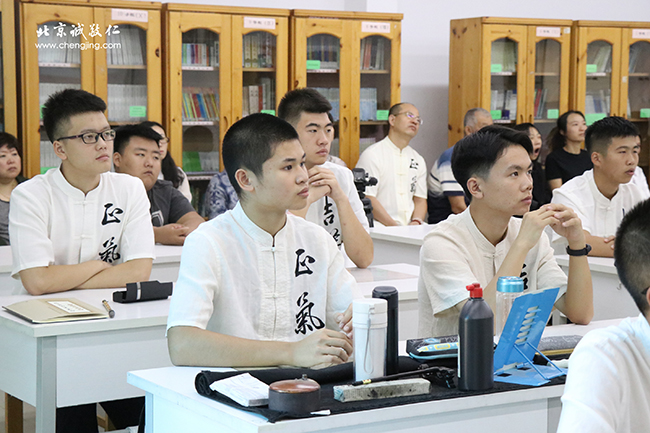 楊老師會篆刻,時間比較短,只有30年(笑)。我的書法從五歲練習,一直到現在50多年沒有斷過。你們都要能傳承。 在新六藝,如果你能練就好的文筆,能寫出好文章,可以流傳多少年?你們看《古文觀止》里面春秋、漢唐時期的文章都可以流傳到今天。王羲之的《蘭亭集序》也是,雖然是后人臨寫的,但到現在一直被大家欣賞學習。好好學習,你的才藝德能是可以被流傳下去的。 我希望以后你們一出手就要有太極功夫,一拿筆就能寫字,會主持、會朗誦。明天開始,早晨你們就要練習大聲讀經,一個人的聲音會影響一輩子的命運,你看國家領導人講話,非常渾厚有力。如果丹田有力量,說話受人歡迎,就有攝受力,能幫助你和人很好地溝通,這非常重要。 再過五十年,你們可能是市長,是一方重要的人物,所以今天要好好學,才能有以后這個身份需要的實力。