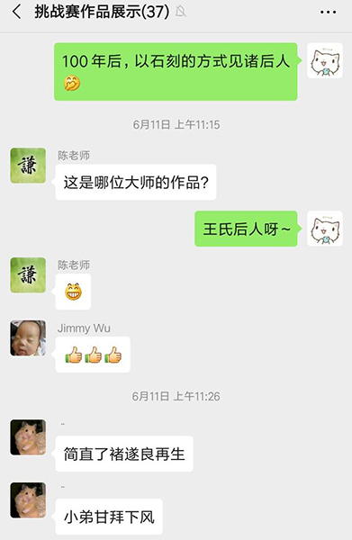 ![]() ![]() 陳同學在江蘇恭書《心經》 習書一年 基礎訓練的牢固,使她在臨習其他書體時進度快了很多,當然也離不開每日的練習。右邊是她寫的《愛蓮說》局部圖。 ![]() ![]() 張同學的書房(江西)也掛著楊老師的吉祥語 她在6月6號的日記上寫到:努力些,總是可以達到的,早晚的事。就如近日習練書法,先有大致的作品安排,寫時就安住手頭的那個字,才容易產生些許的進步。真的欠缺遇事時的鎮靜工夫。 5.一些好玩的 新六藝班的線上書法指導,會在微信群里進行,且每天到知識圈打卡學習心得。 文翰堂是二屆男生的小天地。