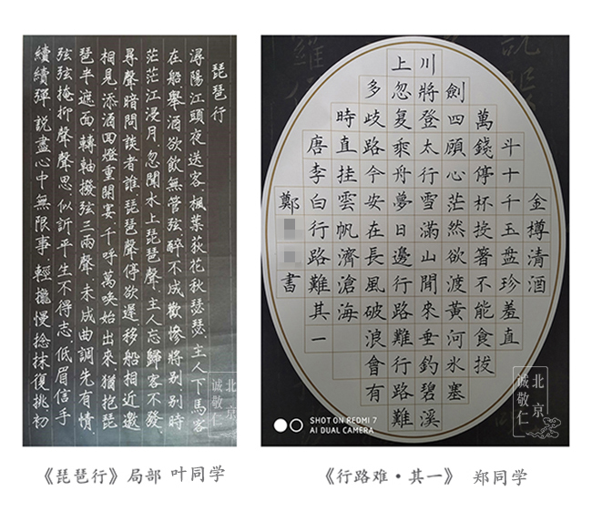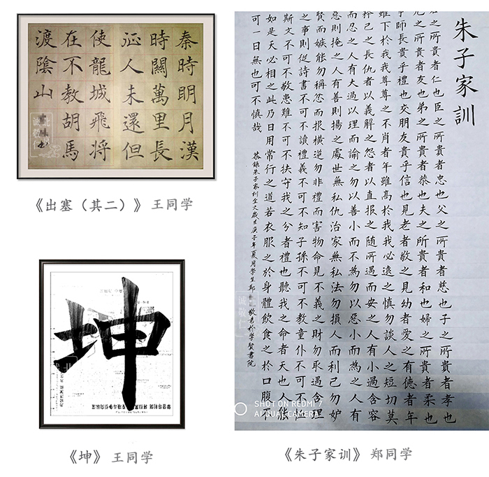 從靜中觀物動,向閑處看人忙,才得超塵脫俗的趣味;遇忙處會偷閑,處鬧中能取靜, 便是安身立命的工夫。 ——《菜根譚》 有幸的是,我們以筆墨作舟,一筆一筆出發,一程一程升華,能以此滋養安身立命的功夫。這次書法挑戰賽設定了半個月的期限,定好目標逐一完成,就會對時間很計較,否則永遠被手機、聊天刷得“沒時間”。 這中間也許會經歷一個很難熬、想放棄的過程,但相信堅持下來的同學都能體會到:隨著一次次挑戰、一步步長進,心眼手的功夫都會更上層樓,這種快樂無與倫比。繼續努力,作為楊老師親傳學生,你們一人學好,可以利益一省一地。 先來欣賞幾幅作品,更多精彩陸續上線 ~