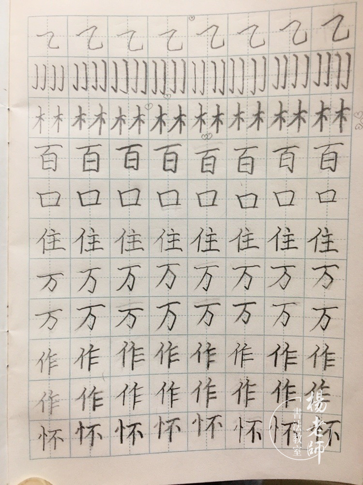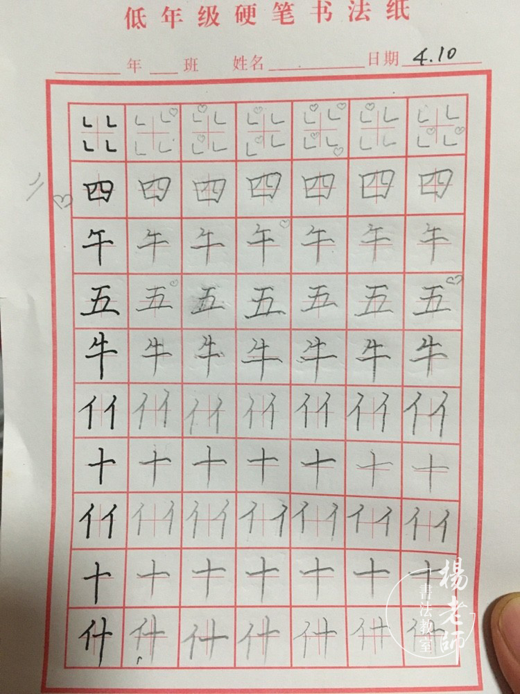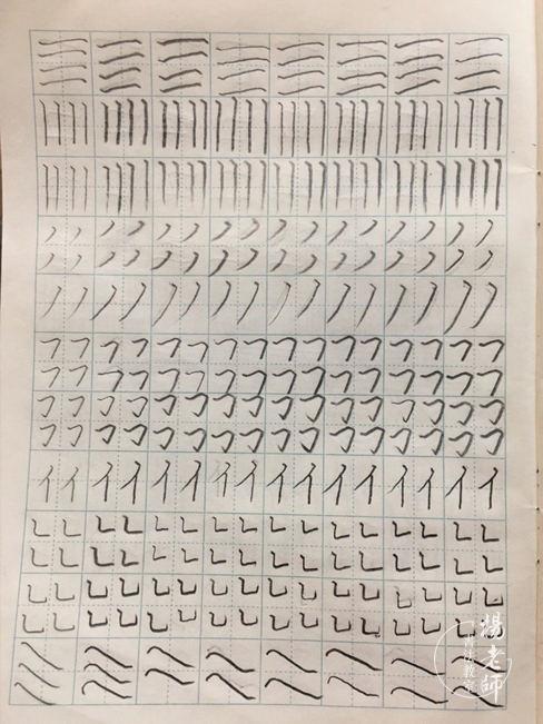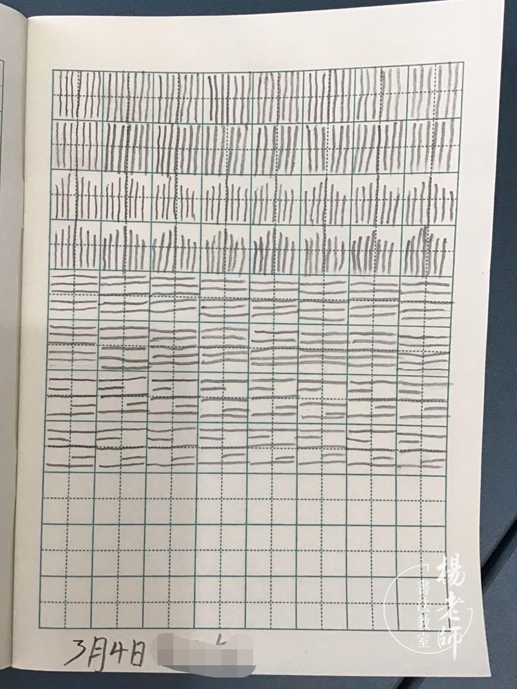 第四期:基本筆畫(huà)和基本字練習(xí) 有了前面三期的基礎(chǔ)練習(xí),孩子們對(duì)控筆有了很大的提升,所以在第四期開(kāi)始學(xué)習(xí)基本的筆畫(huà)和基本字,因?yàn)椴糠趾⒆訉?duì)軟筆有一定基礎(chǔ)和練習(xí),所以在講解硬筆筆畫(huà)時(shí)采用軟筆書(shū)寫(xiě)的方法(如,軟筆:小點(diǎn)下筆,筆毛漸漸鋪開(kāi),頓一下,筆根壓住邊拉邊轉(zhuǎn),收筆頓筆,是一個(gè)由小變大的過(guò)程。硬筆:小點(diǎn)下筆往下拉,停一下頓筆,漸漸加重邊拉邊轉(zhuǎn),收筆停一下頓筆,是一個(gè)由輕到重的過(guò)程。讓孩子們感受到軟硬筆的練習(xí)是相通的,在硬筆中感受筆畫(huà)中輕重停頓的重要性。)所以在第四期中,線條練習(xí)加入了線條粗細(xì)變化練習(xí)(輕重輕、輕重重輕),讓孩子們更有針對(duì)性地進(jìn)一步提升控筆的能力。第四期練習(xí)除了講解基本筆畫(huà),字的練習(xí)是漢字中的數(shù)字練習(xí),起到一個(gè)承上啟下的作用,讓孩子對(duì)數(shù)字又有一個(gè)新的認(rèn)識(shí),每天學(xué)習(xí)一個(gè)漢字?jǐn)?shù)字,還會(huì)練習(xí)本期軟筆課程中練習(xí)的字,讓孩子對(duì)這個(gè)字的結(jié)構(gòu)更加熟悉,做到軟硬筆相結(jié)合練習(xí)。 ∷∷ 第四期 部分作業(yè)打卡 ∷∷