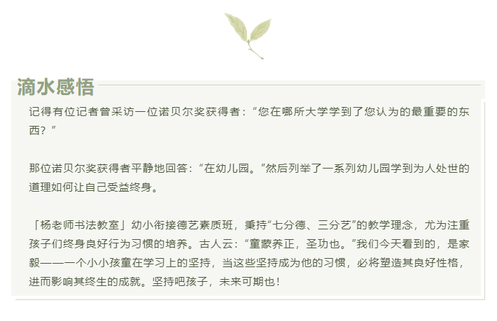 每周一次硬筆課,整整半年多的時間,家毅每一節課都堅持下來了。不僅獲得了老師們的喜愛,家毅自己也愛上了「楊老師書法教室」和硬筆課程。