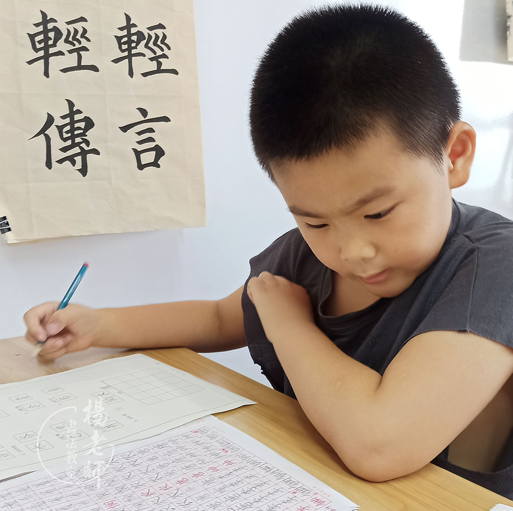 2019年8月,不到五歲的家毅在媽媽的陪伴下,報了「楊老師書法教室」沈陽沈北校區硬筆學習班。老師觀察到他有個優點:年齡雖小,卻坐得住。原來他爸爸是軍人,他自己從小也想當軍人。于是老師鼓勵他:練習書法也要像軍人,有毅力,能堅持!他果然超認真地在那里練習。稚嫩的小手、抿著的小嘴、專注的眼神、愛思考的大腦袋。只見他堅定地握著筆,一筆一畫地用功呢。這樣的孩子實在是太可愛了!