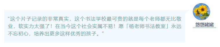 2020年11月19日,「楊老師書法教室」發(fā)布的一則視頻《推薦!好的學(xué)習(xí)氛圍 對孩子學(xué)前影響有多大》在家長群里引起了熱議,大家紛紛留言表達對「楊老師書法教室」教學(xué)的感受。其中有一則留言格外引人注目: