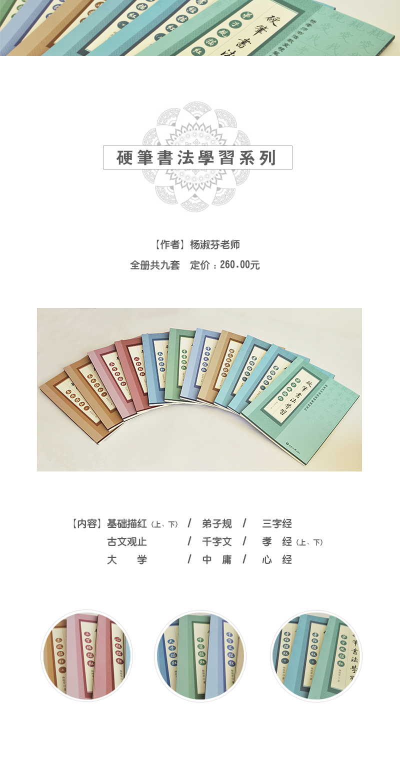 此系列描紅的編排,由基本筆畫(huà)開(kāi)始,逐步進(jìn)階到偏旁部首,以及偏旁部首的運(yùn)用和字體的結(jié)構(gòu),并且將經(jīng)典融入書(shū)法練習(xí)中,在練字的同時(shí),還能接受國(guó)學(xué)經(jīng)典的熏陶。在一筆一劃的描寫(xiě)中漸漸讓身心獲得寧?kù)o,從千百年流傳之經(jīng)典中體會(huì)祖先的人生智慧。在那筆墨與心靈一點(diǎn)契合時(shí),體會(huì)身心一片清涼。