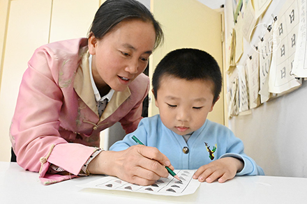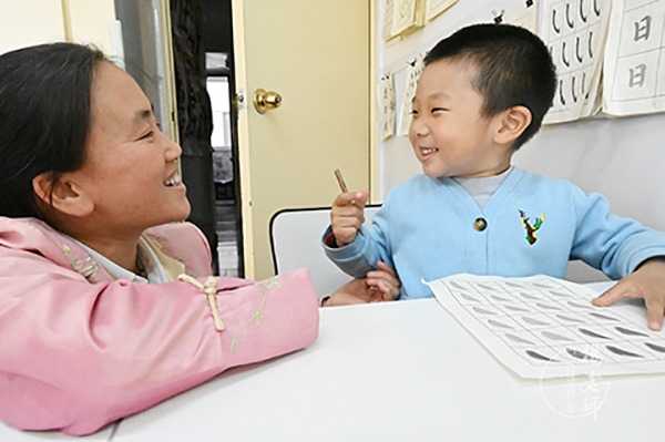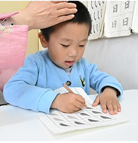 剛來書法教室時,呈現的是天真懵懂,滿眼好奇,注意力不集中,難得聽進老師的話,處理問題以摔打哭鬧跳跑為先,配之以高音量及不耐煩。面對這樣一個比較有特點的小寶貝,老師們以誠摯的愛心,無比的耐心,在日常教學中導之以禮,齊之以規矩,手把手帶,一句一句教,他漸漸學會做力所能及的事,禮貌講話,認真學習,友善處理人際關系。這個雖調皮但萌萌噠的小寶貝,一點一滴地接受了老師如雨潤春苗的滋養,漸漸養成了好好說話、規規矩矩做事、認認真真學習的好習慣。