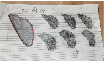 孩子描紅的過程也是變化很大。第一周開始描紅,每次都是我提出來,然后整個描紅過程孩子一會兒說一句話,一會兒一個花樣,有的時候四個點描完甚至要1個半小時,這還是情況好的;有的時候耍脾氣,又哭又鬧,把筆給扔了,怎么勸都不描。那個時候,我的內心很煎熬,也很無助。