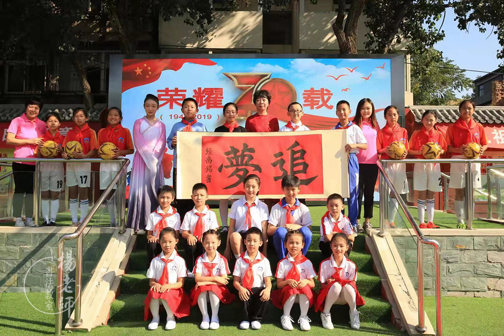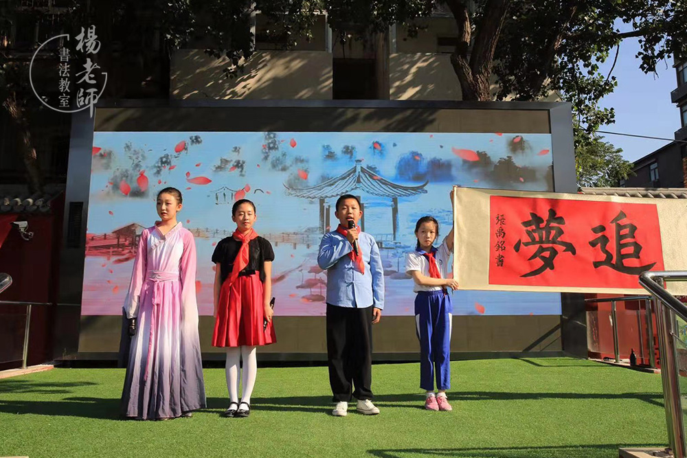 原來,禹銘就讀的學校在開學第一天舉行了“獻禮祖國七十華誕”的開學典禮,而禹銘則作為學生代表現場書寫“追夢”兩個大字,受到全校師生震驚而熱烈的掌聲!