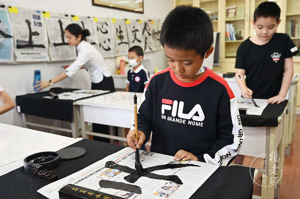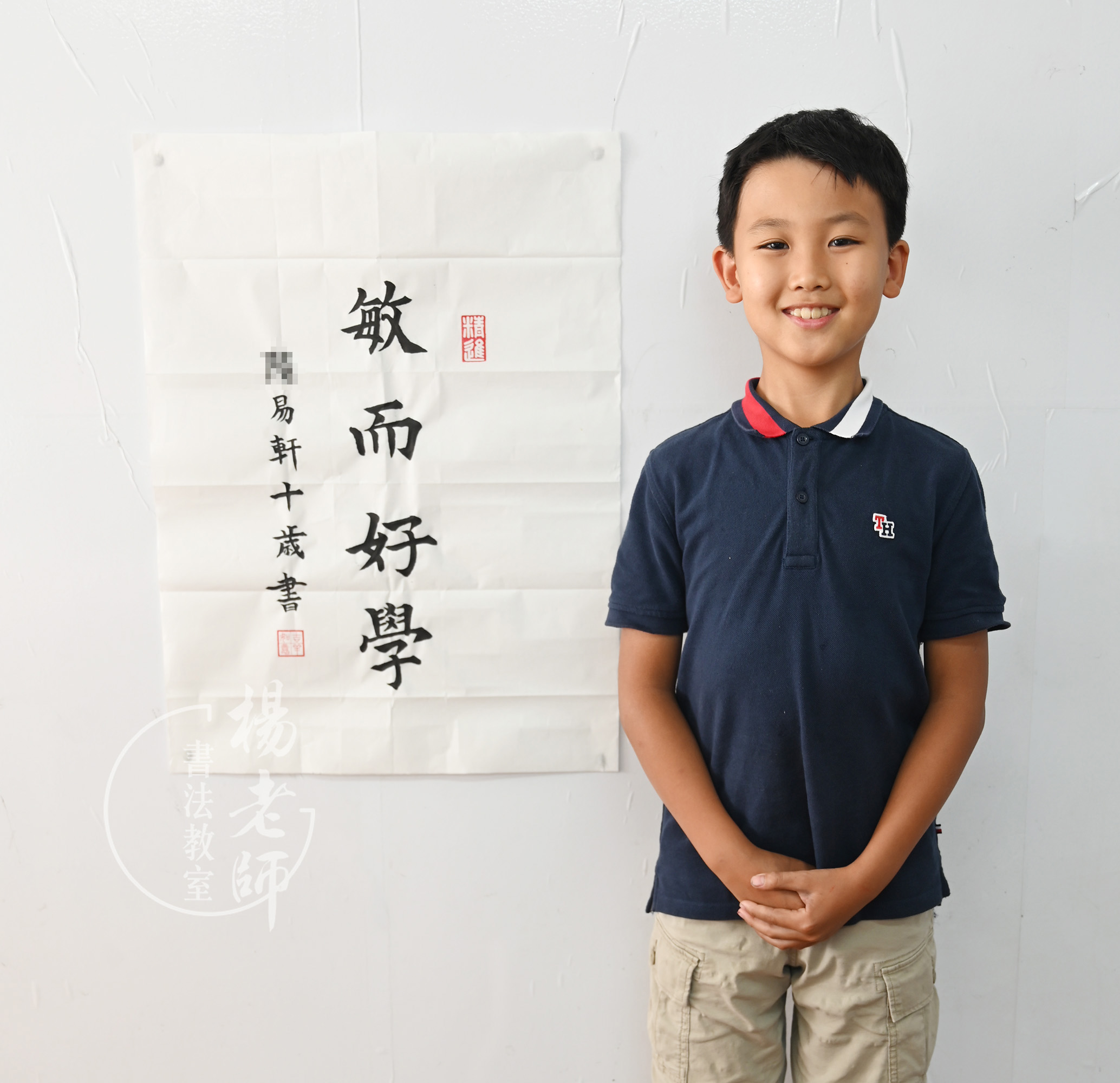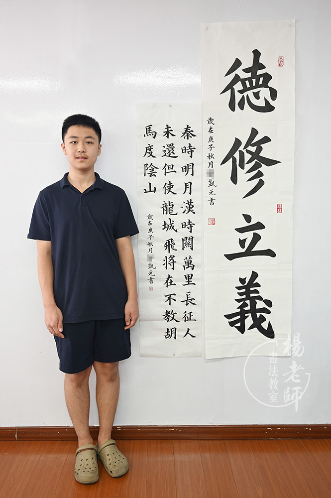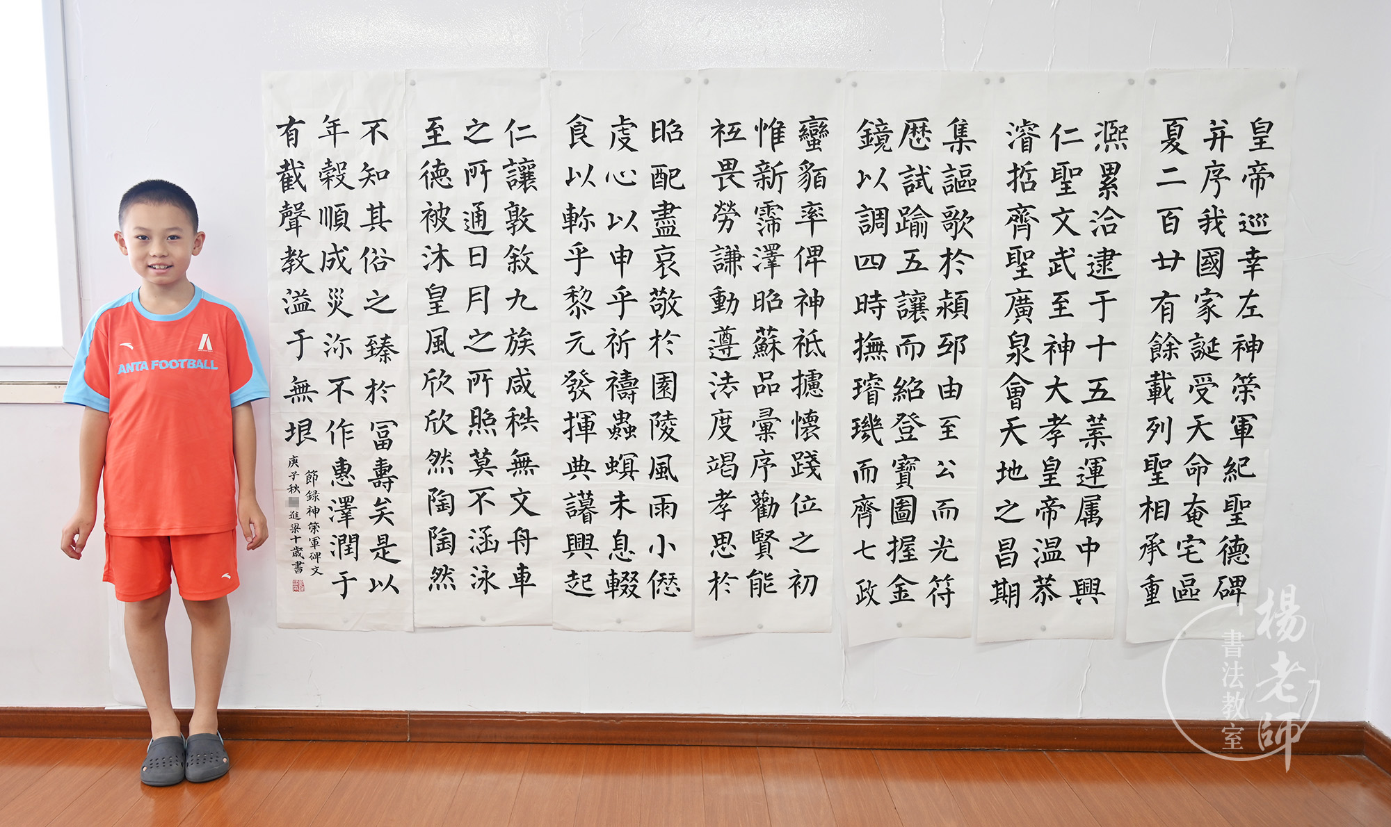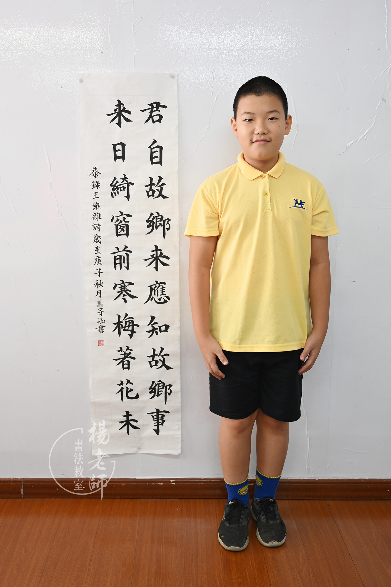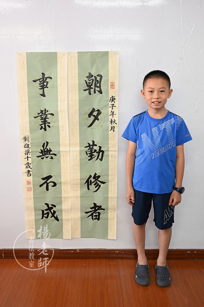 進梁同學便是其中的代表。他四歲多進入「楊老師書法教室」學習,一轉眼已經六年了。這六年里,有母親的一路陪伴,有進梁自己的自強不息。不知克服了多少次節(jié)假日旅游的“誘惑”,堅持來書法教室度過。在繁重的課業(yè)之余擠時間習練,在疫情居家期間苦練長幅作品。精雕細琢的一筆一畫,是經過萬千次反復錘煉后凝結出的精華。這需要在平常日子里自律潛沉地堅持??菰?、單調、寂寞嗎?不,下筆有明師先賢的諄諄教誨,四海之內有無數靜靜的同行者,于無聲處樂在其中。