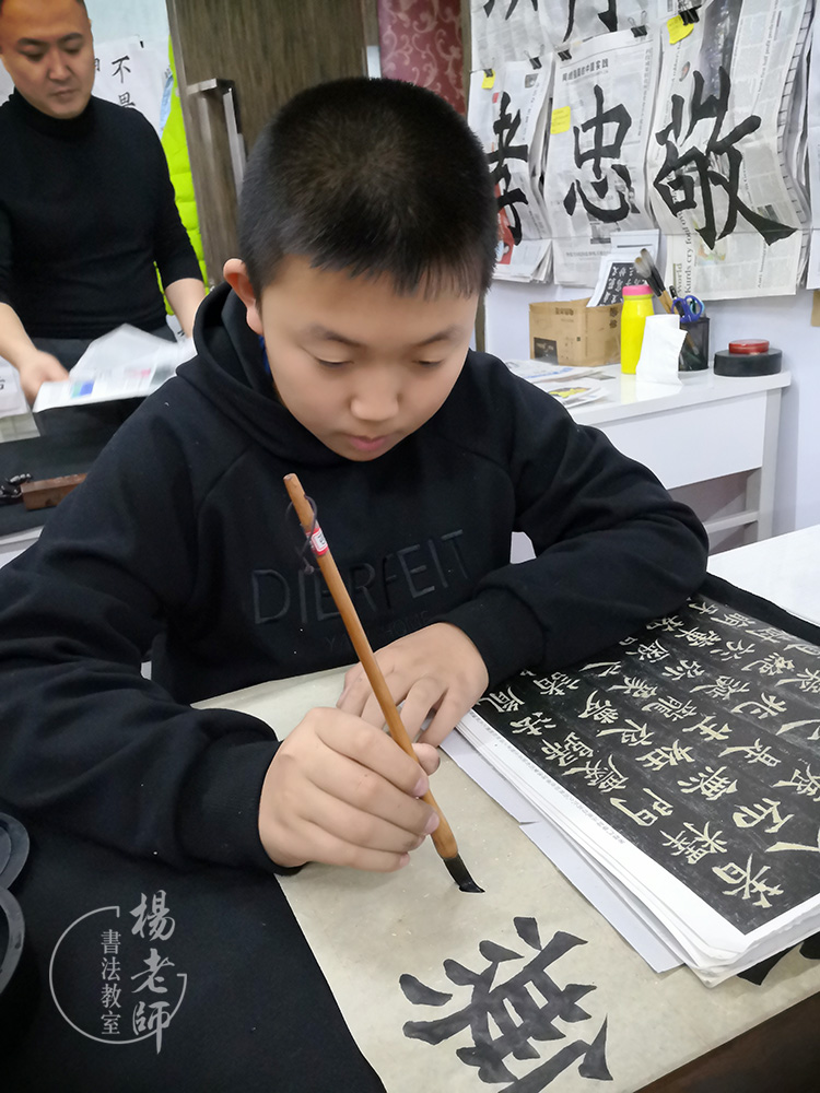 禹銘是在即將上小學(xué)三年級(jí)之前的暑期開(kāi)始學(xué)習(xí)書(shū)法。那時(shí),「楊老師書(shū)法教室」海淀分校區(qū)剛開(kāi)張,禹銘是第一個(gè)進(jìn)教室學(xué)習(xí)的學(xué)生。他給人的印象是比較實(shí)干、努力。每節(jié)課他都很珍惜,非常注意保持正確的站姿和書(shū)寫(xiě)姿勢(shì),因?yàn)檎J(rèn)真全神貫注投入,經(jīng)常會(huì)寫(xiě)到滿頭大汗。