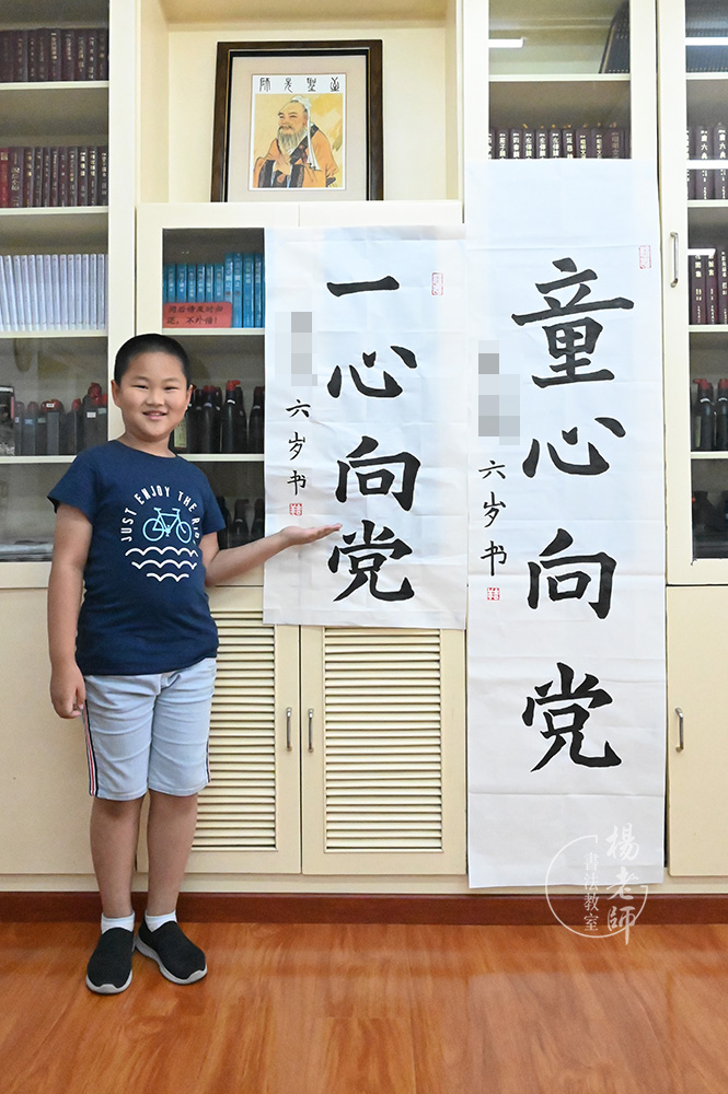 | 以上四位同學均在三歲半左右就來到「楊老師書法教室」孝悌班學習。在「七分德 三分藝」的教學理念指導下,他們在這里接受了非常全面的德藝學習。不僅能寫得一手好字,更在心中深深扎下感恩與愛的種子。在建黨一百周年之際,他們寫了多幅敬黨愛黨的作品,以表達“請黨放心,強國有我”的豪情壯志。