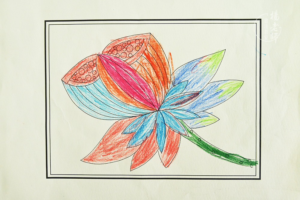 這幅是十一月份的彩繪作業,兩個多月就有了很大變化,看著整潔規矩多了,細節的圈圈點點也能穩穩地把控不出邊框,顏色也非常靚麗好看!您是否會相信出自三歲孩子之手呢?!