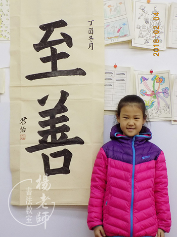 書寫「至善」,代表媽媽參加公司的書法展,為媽媽爭光,善體親心,孝心可嘉。