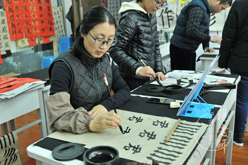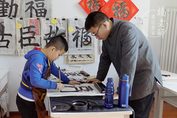 “紅紙一分鐘,報紙十天功。”正在報紙上練習,熟練之后,從容地書寫于紅紙,最后和老師選出最滿意的作品,過年看望長輩時送給老人家,恭祝新年快樂!
