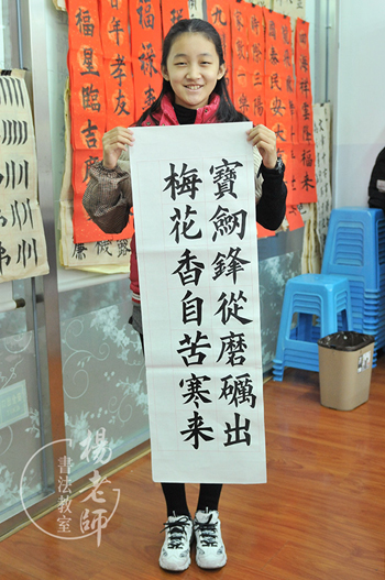 四年級的王同學,習書五年,正在練習對聯準備送給長輩和好友,王同學很認真地說:未學習書法前,心很亂,無所事事,學書法后,心安定了,還找到了“好朋友”!