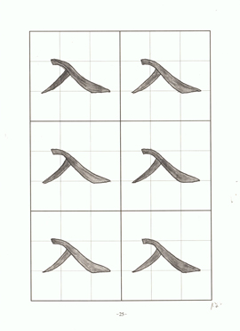 一個月后,從她描寫的「方頭點」看來,她一節課可以完成半張描紅,且筆劃溫順,愈來愈有力道。
