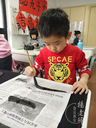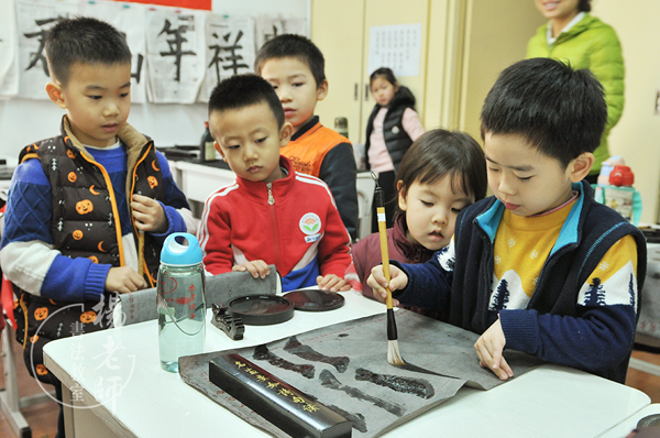習練書法時,小石頭沒有抓緊時間,老師叮嚀道:“你不應該在此浪費時間,以少為足,看看同學們都那么認真,你是不是也應該好好努力?”小石頭懂事地點點頭,開始認真書寫。復習完基本筆畫,小石頭正寫到“二”字,還寫得歪歪扭扭就打算往下學新的,老師義正言辭地說:“學過的字還沒學扎實,不往下學。學一樣就要像一樣,規規矩矩的才行。”老師指著范字對小石頭說:“你要好好地觀察,楷書是比例協調的,就像我們的眉毛、眼睛、鼻子、嘴巴有各自的位置和協調的比例。”小石頭聽了老師生動的比喻,耳目一新,加足馬力。當“調皮軍隊”又來干擾他時,老師督導他:“提起正氣!要像自己的姓氏一樣優秀,做龍的傳人!”他挺起胸膛,瞬間充滿電,能量豐沛。