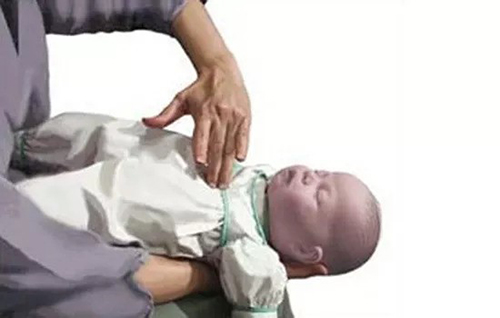 2.以兩手的中指或食指,放在寶寶胸廓下和肚臍上的腹部,快速向上重擊壓迫,但要很輕柔;