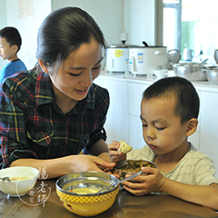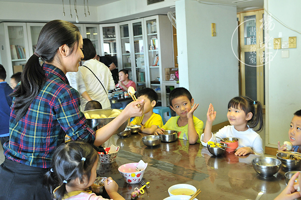 有孩子吃飯聲音太響,老師教導孩子改正用餐方法,不用力啜飲湯汁,而是用勺送湯入口,自然而又無傷大雅。