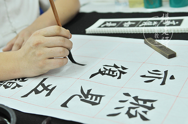 雷同學,初學需較多時間調整狀態。老師指導道:“書法,注重力道,要將全身放松的力量滲透到字的筋骨里。”雷同學依教奉行。