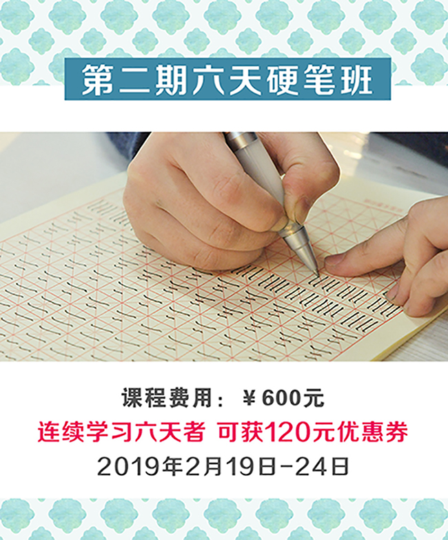 在2019年1月19日至26日「楊老師書法教室」首期開設的硬筆七天集中學的課程中,老師帶領孩子們全方位地學習了硬筆書法的入門要領,孩子們在七天集中學習中已經掌握了硬筆初階學習的技能要領。為循序漸進地幫助孩子們書寫一手受益終生的硬筆書法,「楊老師書法教室」將在寒假最后一周,為大家帶來為期六天的硬筆書法課程,希望能幫助孩子們在歡樂的寒假結束前,收攝精神,習字養性,以良好的學習狀態迎接新學期的到來。