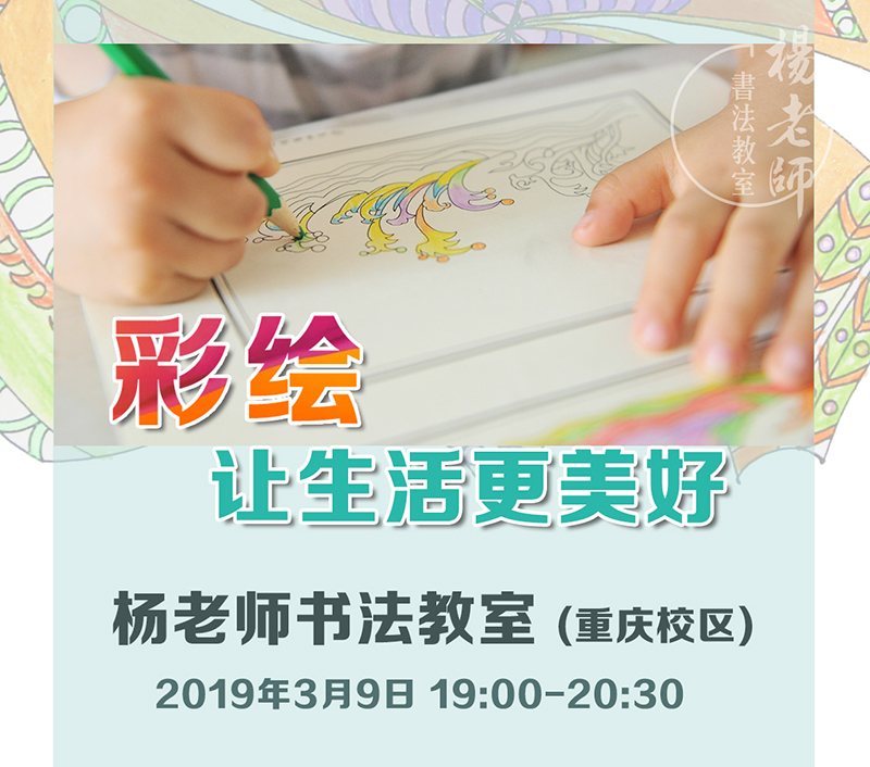 為了幫助孩子培養良好的興趣愛好,令身心全面和諧發展,以及為了讓老人們建立良好的興趣愛好,找到晚年的安詳和快樂,「楊老師書法教室」 ——重慶校區,將在2019年3月伊始,舉辦「彩繪讓生活更美好」公益課。