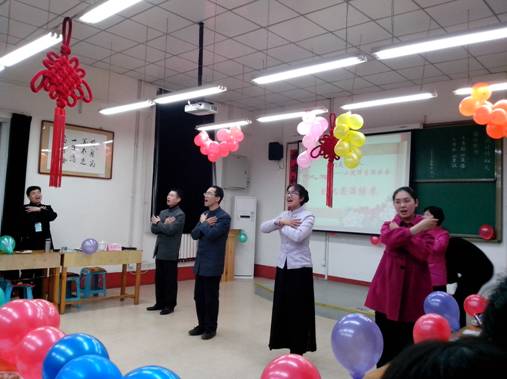 當歌曲《一家人》在眾人的耳畔徐徐響起,整個晚會也隨之步入了尾聲。只見師資班班主任石朝陽老師、副班主任虞向陽老師、書法指導教師陳靈寶老師等幾位老師走上舞臺,表演起手語舞蹈,在座的老師們也都隨著做起來。教室里其樂融融。