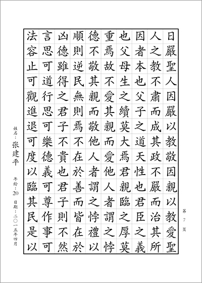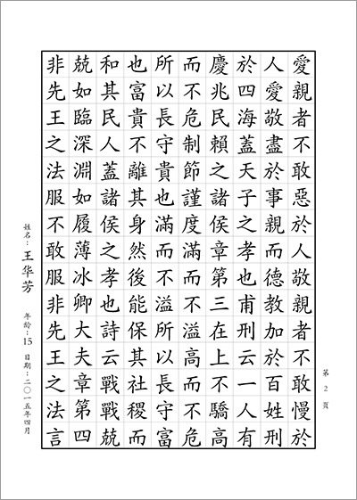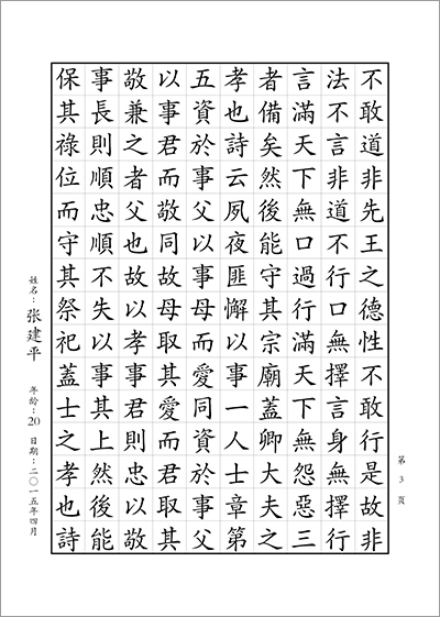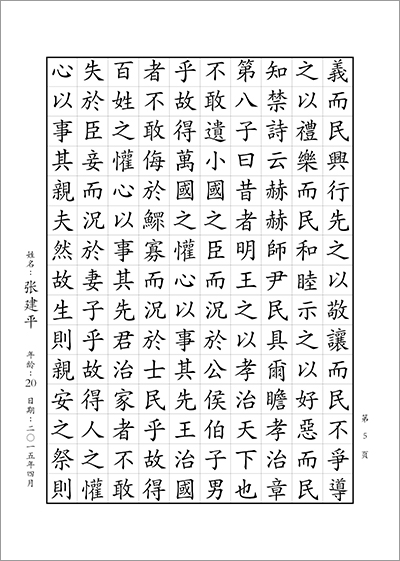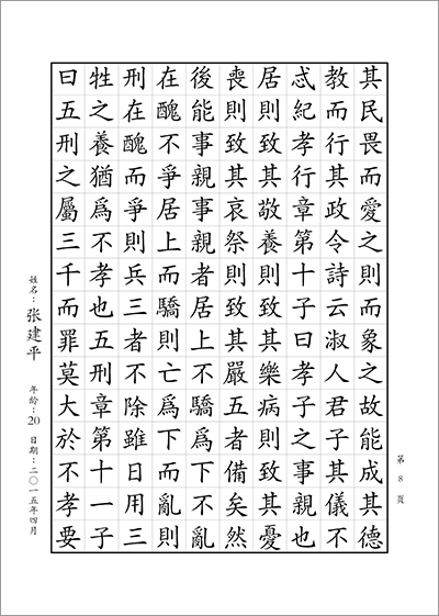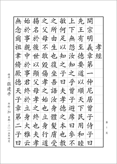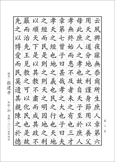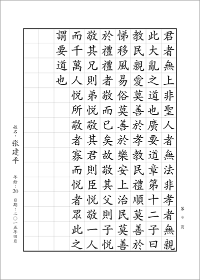青年和成人組書寫內容:書寫正體字版《孝經》1—12章 (共計9頁;合計1296字)。