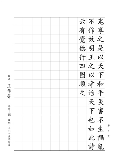 少年組書寫內容:書寫正體字版《孝經》1—8章 (共計6頁;合計776字)。
