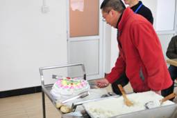 在閃爍的燭光前,兩位老師雙手抱拳于胸,默默地許下了自己心中最美好的祝愿,同時(shí)也表達(dá)了自己對父母的感激之情及對大家的深深謝意,之后為大家切開了香甜的生日蛋糕。