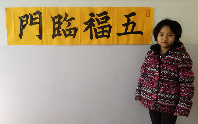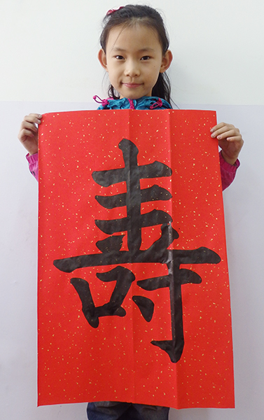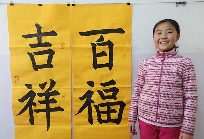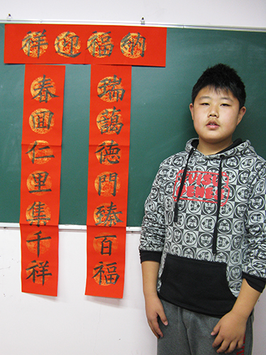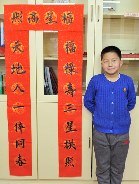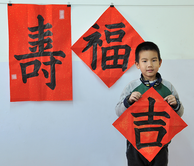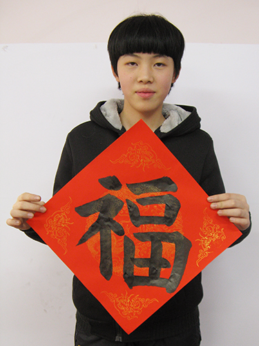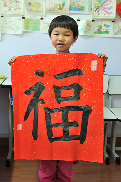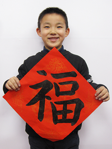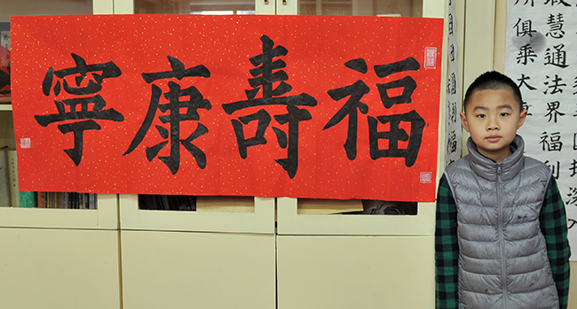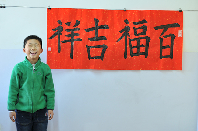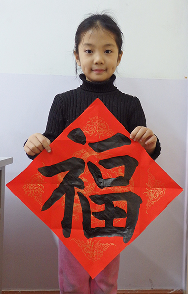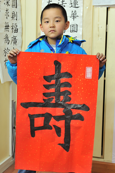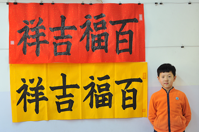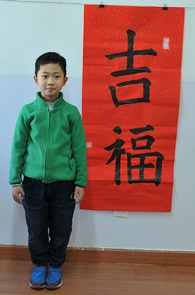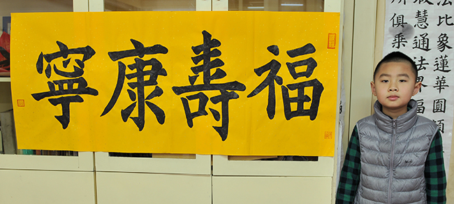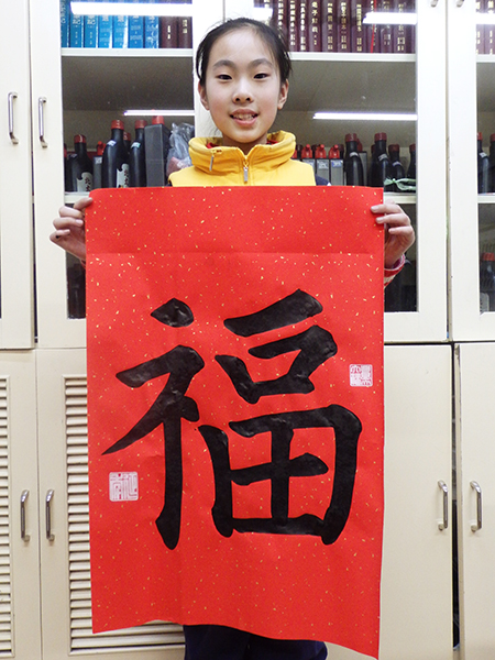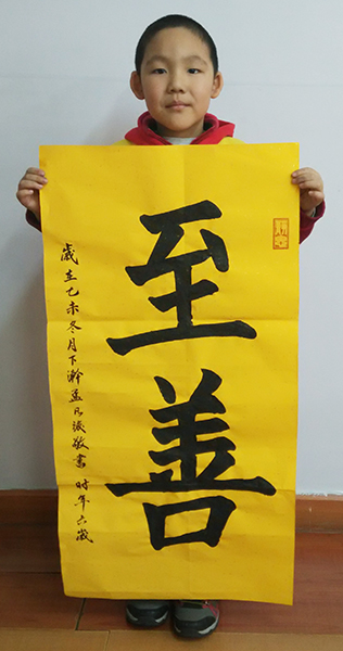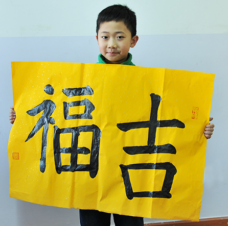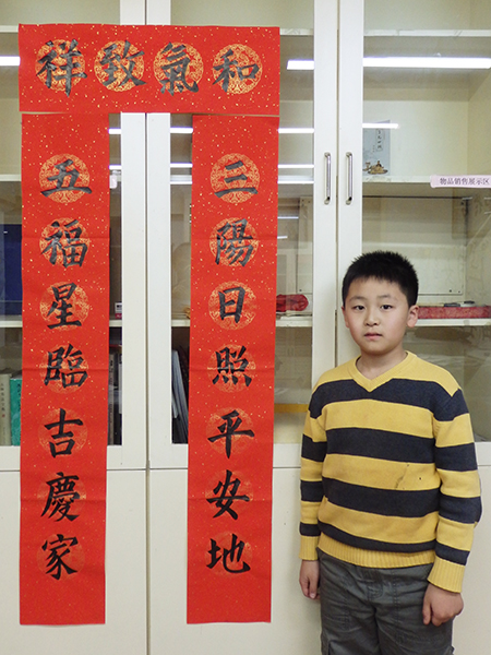4. 充分利用寒暑假,因平時大部分孩子就一周一次課,平時在家又很少有時間練習,所以寒暑假集中學習能大幅度幫助孩子提升,同時也易于激發起孩子學習的激情。比如鄭凱元同學,石昊健同學,劉恬源同學正是利用今年寒假,集中時間來練習小字對聯的最好證明,他們不僅為自己寫,還寫了送親朋好友。另外楊一丁同學,暑期有參加過兩次夏令營,寒假今天越堅持不斷到書法教室上課,還記得他第一次夏令營期間絕大部分時間一直寫水寫布,很少用墨汁,因他會把墨汁弄得到處是,需要花很長時間來清理,用過的報紙總是凌亂的,來書法教室一年后有了大幅度的提升,現在報紙自己可以整理得很整齊,用墨汁也比較文雅了,而且還喜愛上了書法,今年寫了漂亮的大「福」字送給來北京看他的奶奶作為禮物。陳湘旭同學平時來上課的時間差不多兩周一次,但她每年暑假都會去通州學習,所以她的提升得益于此,其他如郭博文,邢萬里等一些學員也都又參加過暑期的夏令營,無論是書法還是個人自理能力,品德都有助益,此不足一而述了。